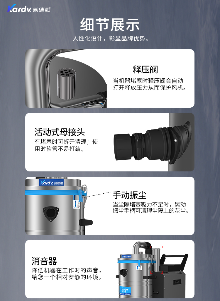 SK-610是一款自主研發的工業吸塵器。采用工業設計風格,做工好,美觀大氣,黑灰色調搭配彰顯本機的工業風格。電控系統采用簡單易操作的按鍵式控制系統,有防缺相,漏電,過載的保護。動力源采用凱德威FY2.2定制主機,主機葉片以及外殼為合金材料壓鑄成型,再經過整體拋光噴涂,相對控制了整機的熱脹冷縮,風量穩定,并選用了質量穩定的軸承。