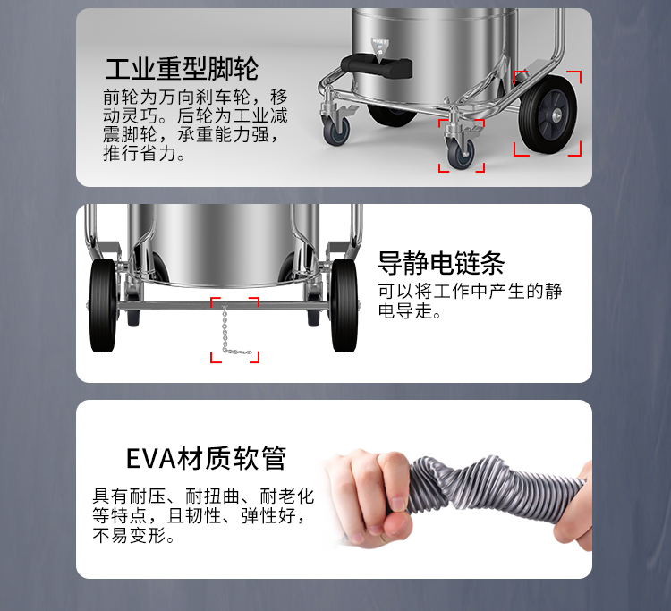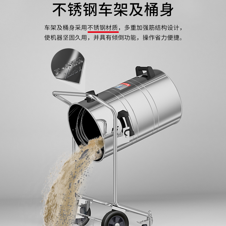 GS-2078B是一款工業型吸塵器,集塵桶為80L,為不銹鋼材質,配有不銹鋼車架,在移動時輕巧方便;可以用在工廠、倉庫或建筑工地等場所清理灰塵等,在商業環境中也可以使用。