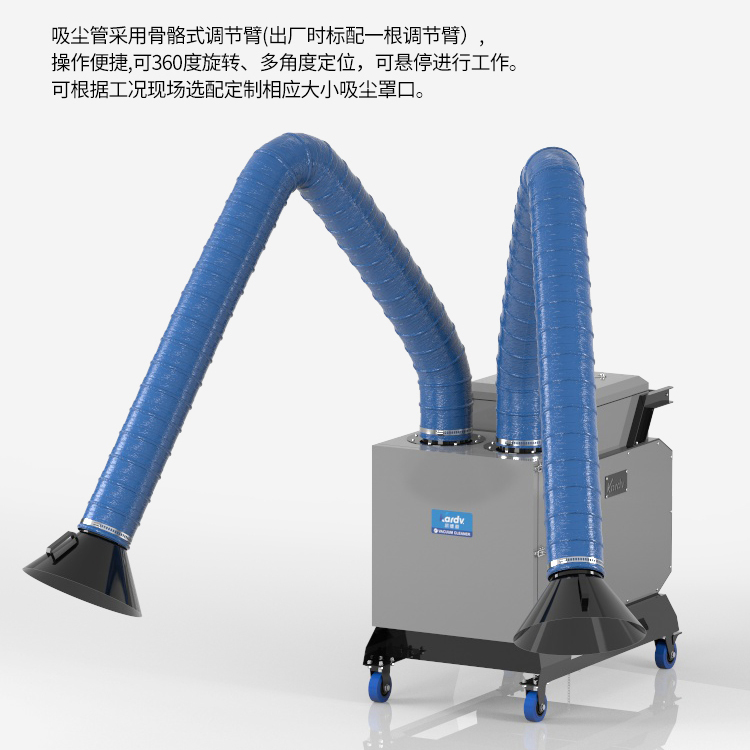 金屬焊接、激光切割、打磨作業時,大量煙塵懸浮在車間內,被吸入人體肺部影響身體健康,因此在焊接煙塵進入焊工呼吸區前把這些煙塵進行凈化處理。凱德威移動式焊接煙塵凈化器是一款治理焊接、切割、打磨時,產生在空氣中大量懸浮危害人體的細小煙塵顆粒而設計的凈化裝置,可移動式單機處理或多工位系統集中式處理。配有1根2.5米長的吸氣臂,在不同的工作地點移動靈活,操作方便。