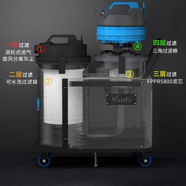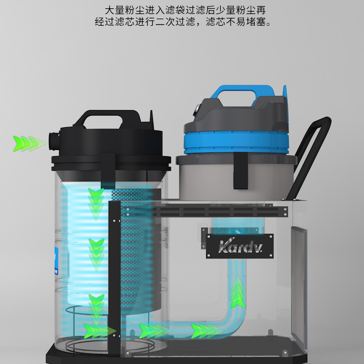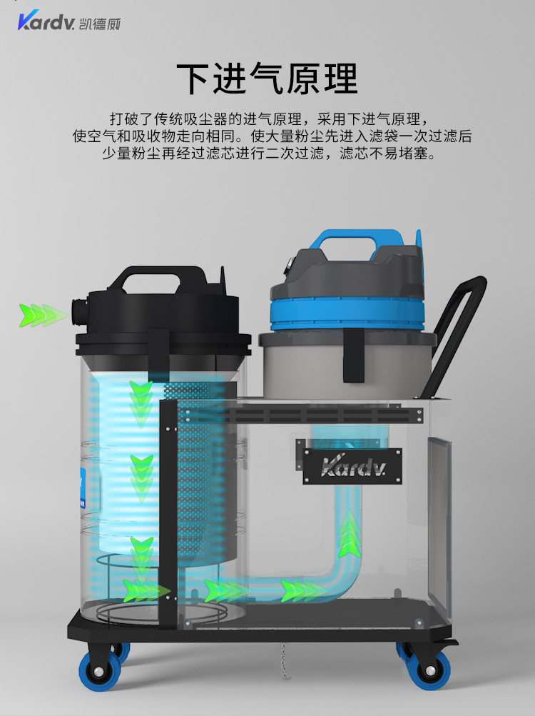 DL-3078X由我司設計,區(qū)別常規(guī)吸塵器的進氣方式,采用下進氣原理,在吸細小粉塵、紡織廠棉絮、棉絲等容易堵塞過濾器的垃圾時,使大部分垃圾直接進入布袋過濾,少量物質再經過濾器二次過濾,這樣解決了過濾器易堵塞的問題。